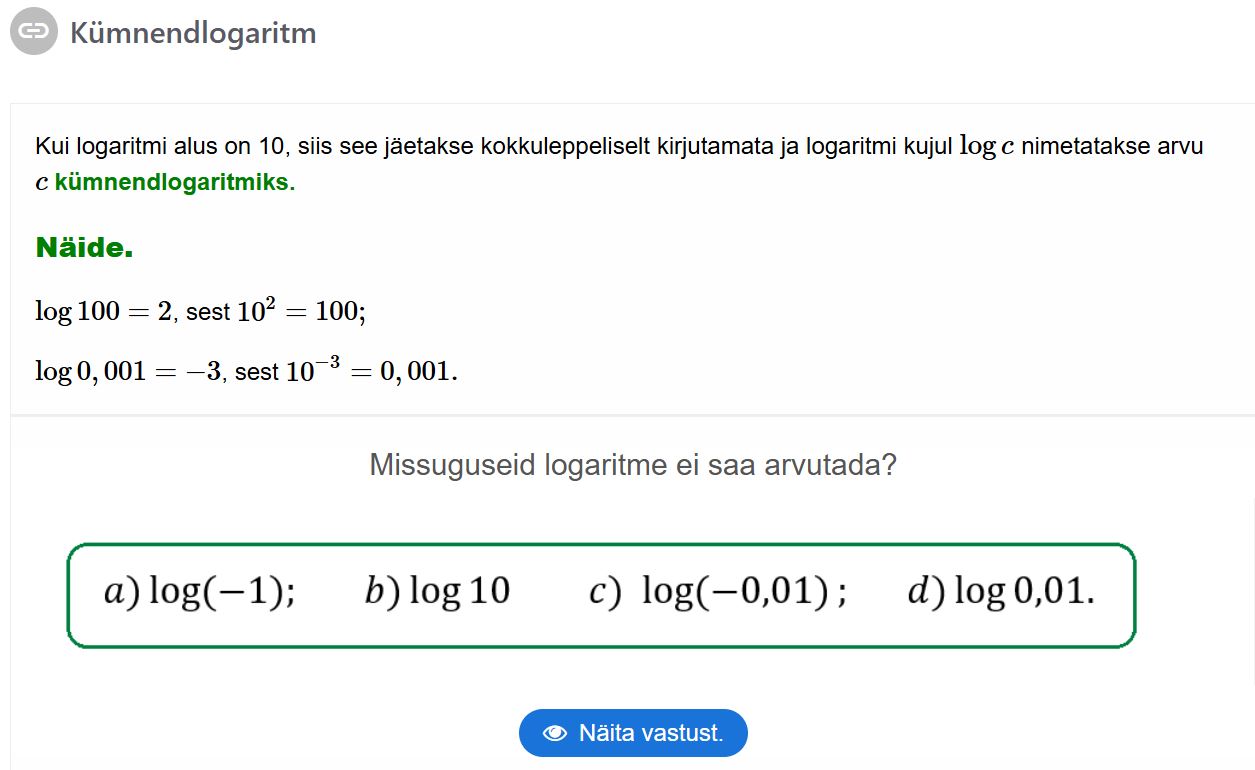 Õpiobjekt tutvustab kümnendlogaritmi mõistet, mis on logaritmi erijuht alusel 10. Objekti sisu aitab mõista, et kümnendlogaritm on lühimärge, mille puhul alust 10 ei kirjutata