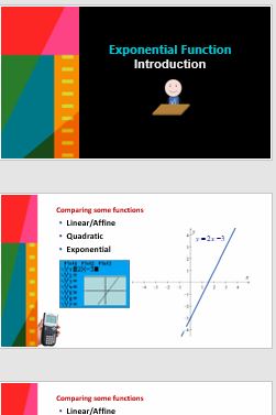 Introdutory tutorial on Exponential Functions and its distinction from linear and quadratic ones. Sequential PowerPoint presentation with application examples.