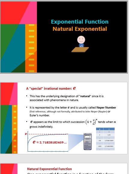Tutorial on Natural Exponential Function, Euler’s Number. Sequential PowerPoint presentation with application examples.