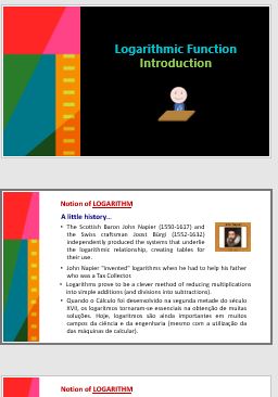 Introdutory tutorial on the notion of Logarithm and Logarithmic function with a bit of history. Sequential PowerPoint presentation with application examples.