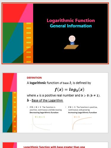 Tutorial on logarithmic function and respective general characteristics: Domain, Monotony, Asymptotes, etc. – analysis based on the base value. Sequential PowerPoint presentation with application examples.