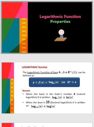 Tutorial on logarithmic function properties: Basic, Operative and base exchange. Sequential PowerPoint presentation with application examples.
