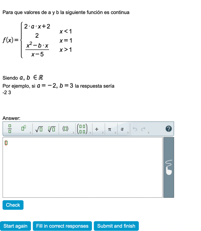 Pregunta interactiva que se puede incluir en un curso de Moodle. Ejemplo de estudio de la continuidad de funciones con parámetros.