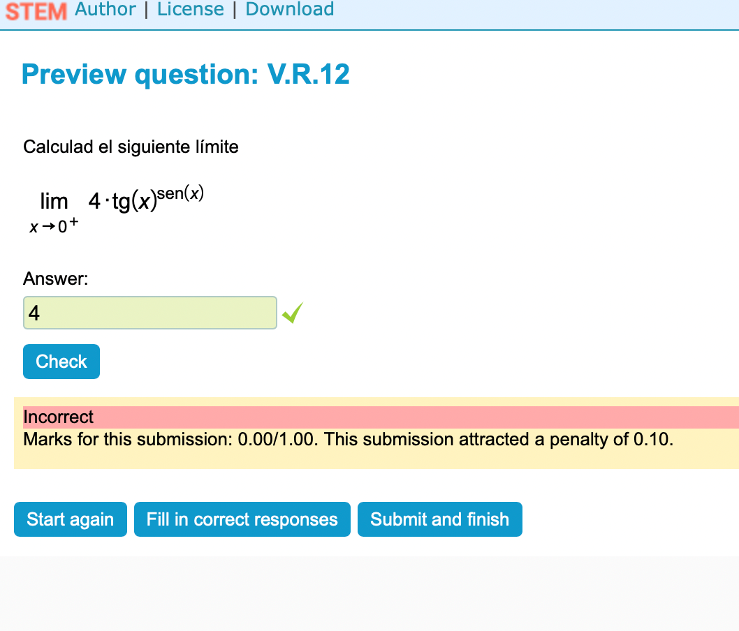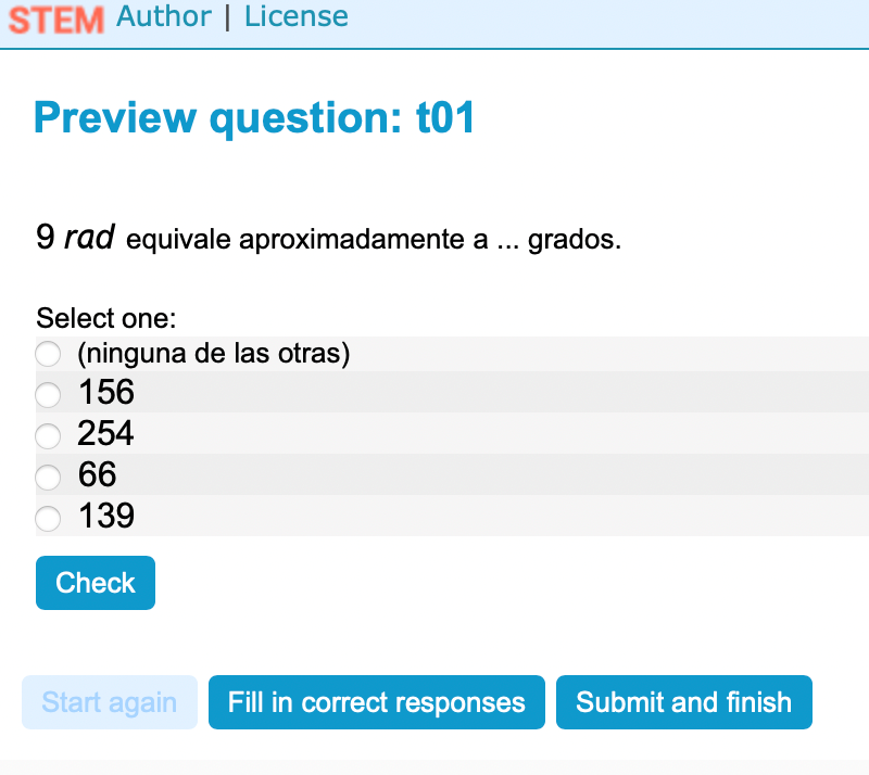 Puedes validar tu respuesta, rellenar les respuestas correctas y empezar de nuevo con otra pregunta similar. También se puede obtener el algoritmo de creación de la pregunta y descargarlo para obtener per obtenir el HTML de la pregunta.