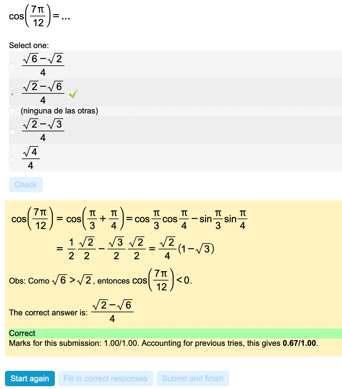 Trigonometría, Coseno, Pregunta interactiva, Moodle