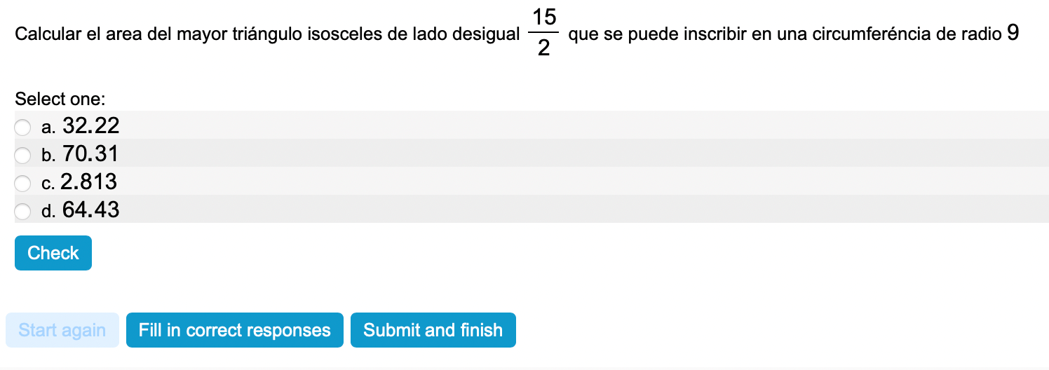 Pregunta interactiva. Calcular el área de un triángulo isósceles inscrito en una circunferencia.