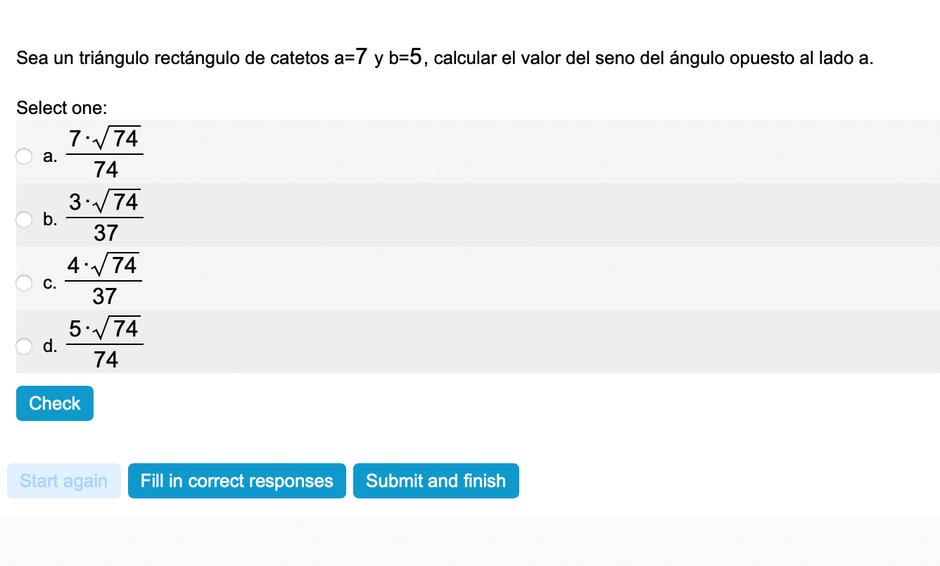 Pregunta interactiva. Calcular en un triángulo rectángulo el seno del ángulo opuesto a un lado dado.