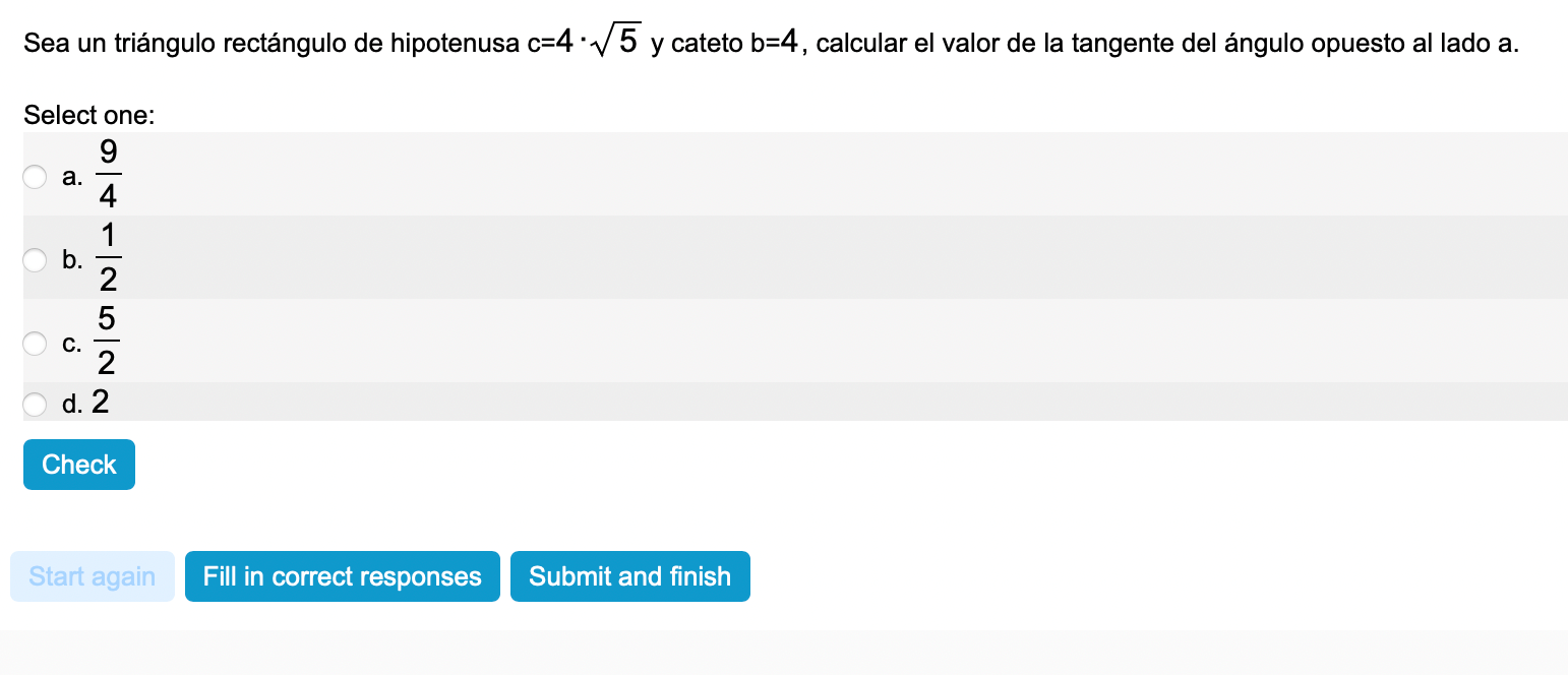 Pregunta interactiva. Calcular en un triángulo rectángulo la tangente del ángulo opuesto a un lado dado.