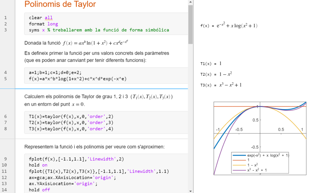 Codi de MATLAB per a aproximar funcions exponencials i logarítmiques per polinomis de Taylor al voltant de 0. Trobar els polinomis de Taylor, fer la representació gràfica i utilitzar-los per a aproximar un valor de la funció. (mlx editable). És necessari MATLAB.