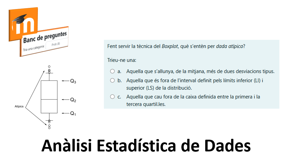 Grup de 8 preguntes de test per a Moodle sobre coneixements bàsics d’Anàlisi Estadística de Dades: quartils, boxplot, dades atípiques.