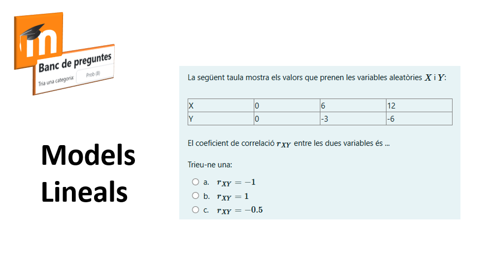 Grup de 5 preguntes de test per a Moodle sobre coneixements bàsics de Regressió Lineal: covariància, coeficient de correlació, variància residual.