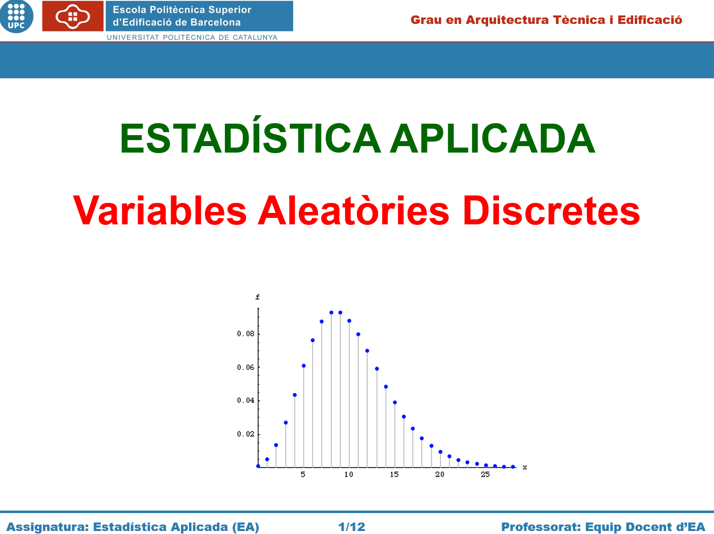Continguts que s’hi tracten: Definició de la funció de probabilitat i de la funció de distribució, esperança i variància d’una variable aleatòria discreta, Teorema de Txebyshev, distribució Binomial, distribució de Poisson, aproximació de la distribució Binomial per la distribució de Poisson.