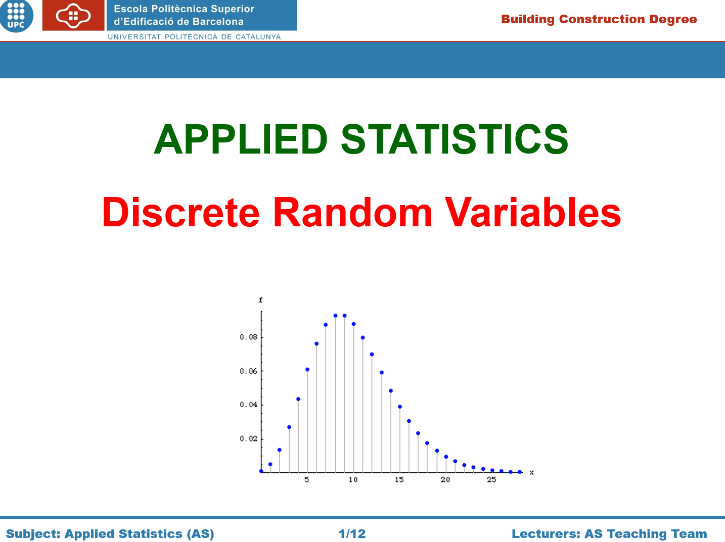 Slide show set for a basic course in Applied Statistics on Discrete Random Variables. The document contains illustration and calculation examples. Editable pptx file.