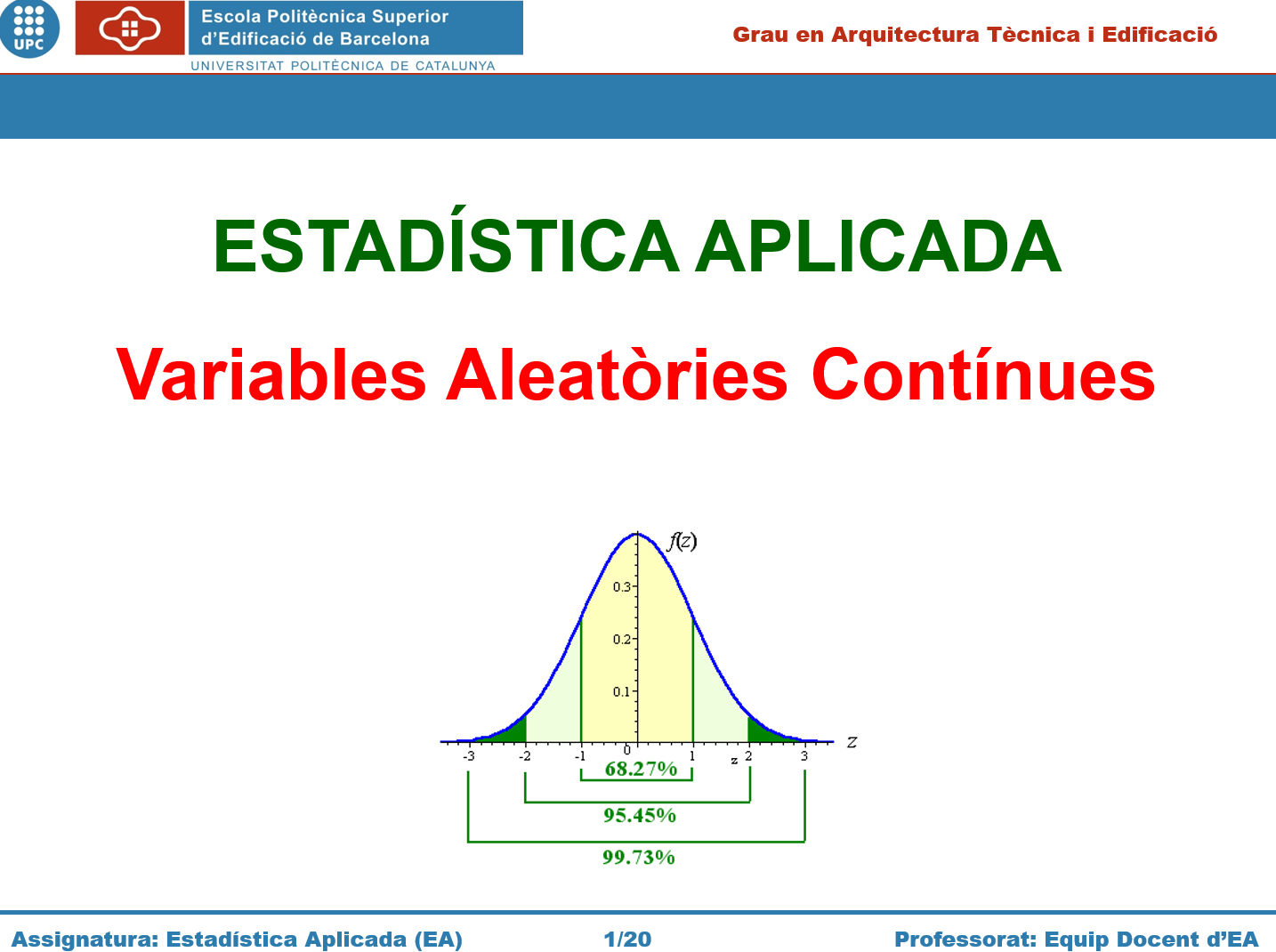 Continguts que s’hi tracten: Definició de la funció de densitat i de la funció de distribució, esperança i variància d’una variable aleatòria contínua, Teorema de Txebyshev, distribució Normal, aproximació de la distribució Binomial per la distribució Normal, distribució Khi-quadrat i distribució t-student.