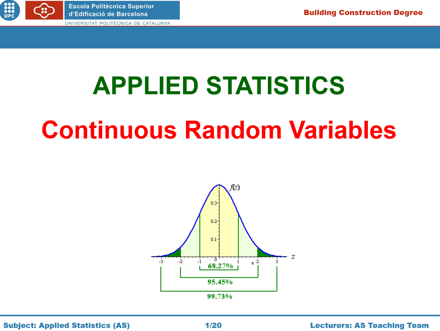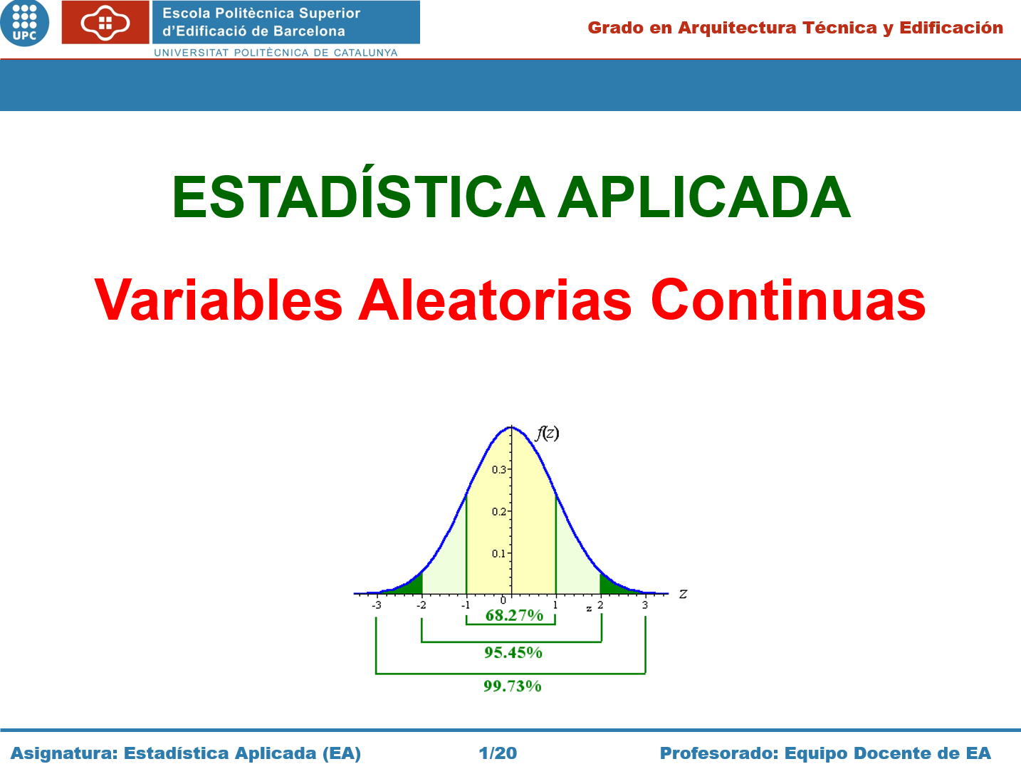 Joc de transparències per a un curs bàsic d’Estadística Aplicada sobre Variables Aleatòries Contínues. El document conté exemples d’il·lustració i de càlcul. Fitxer ppt editable.