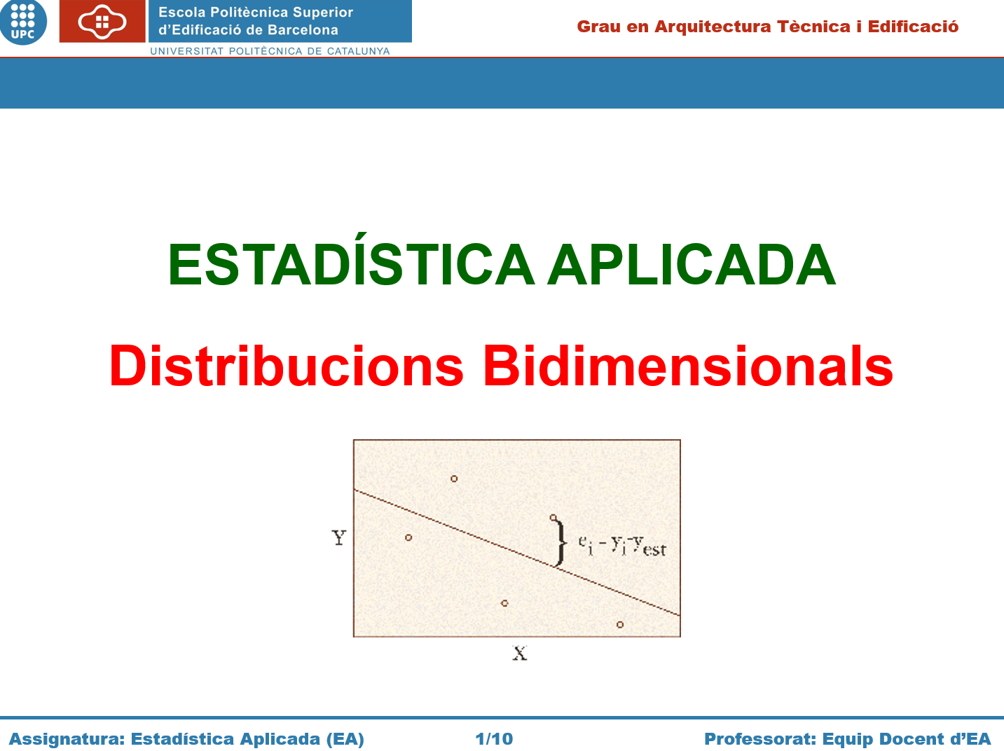 Continguts que s’hi tracten: Definició de distribució bidimensional, distribucions marginals, covariància, recta de regressió, coeficient de correlació lineal i coeficient de determinació.