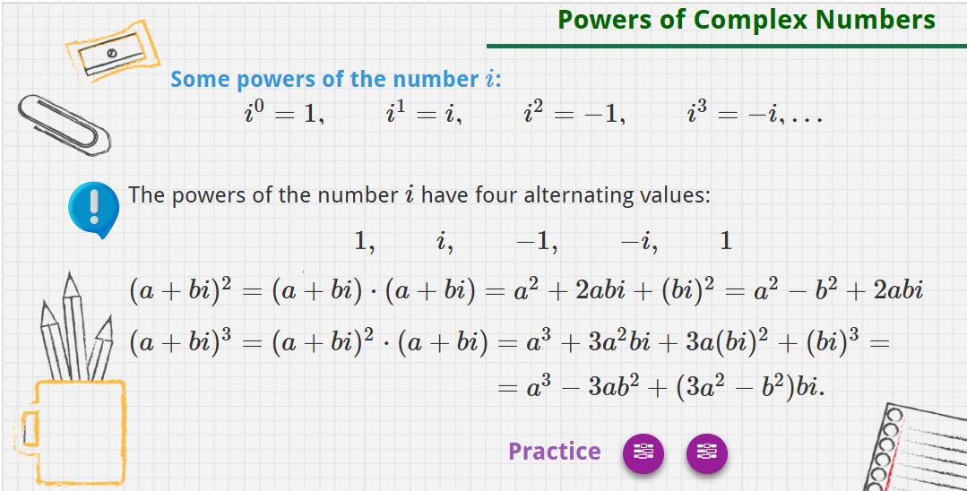 This OER covers the powers of complex numbers in algebraic form. Interactive exercises guide students through step-by-step calculations and visual representations on the complex plane. The resource helps learners develop a strong foundation in complex number operations for further mathematical applications.