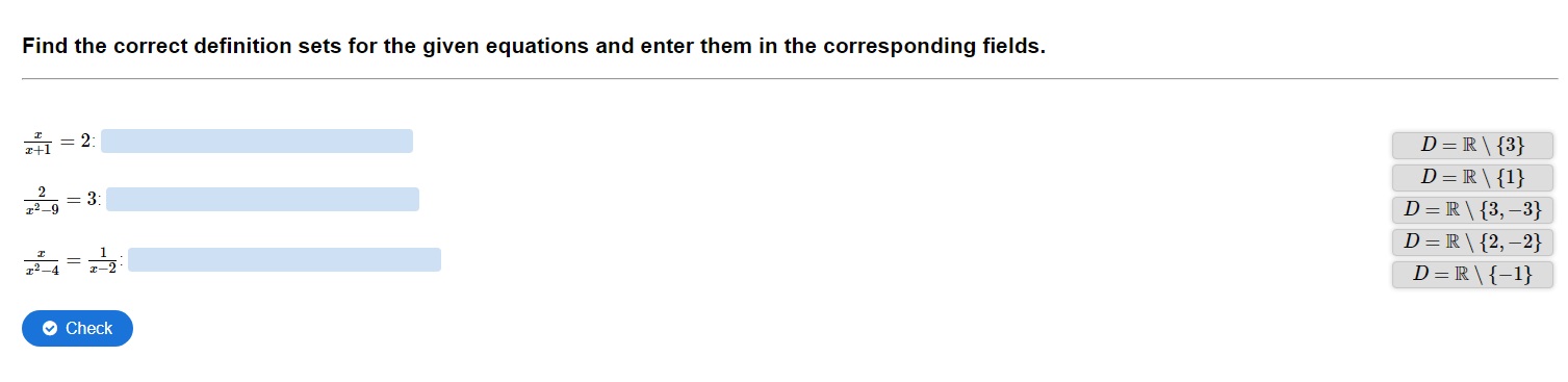 Task: Find the correct definition sets for the given equations